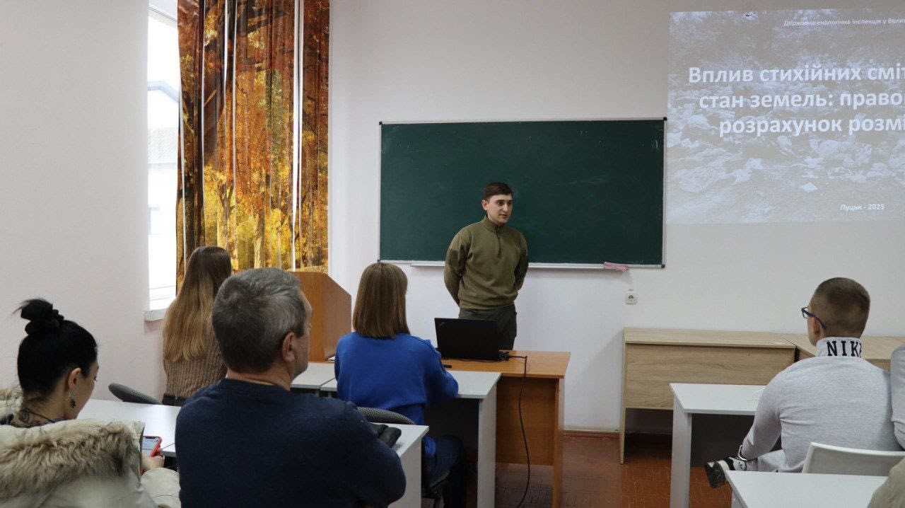 У Луцькому національному технічному університеті відбулася зустріч зі здобувачами вищої освіти, під час якої заступник начальника відділу державного екологічного нагляду (контролю) земельних ресурсів та надр Цюх Ярослав Олександрович представив ключові аспекти діяльності Інспекції та окреслив актуальні проблеми у сфері управління з відходами.