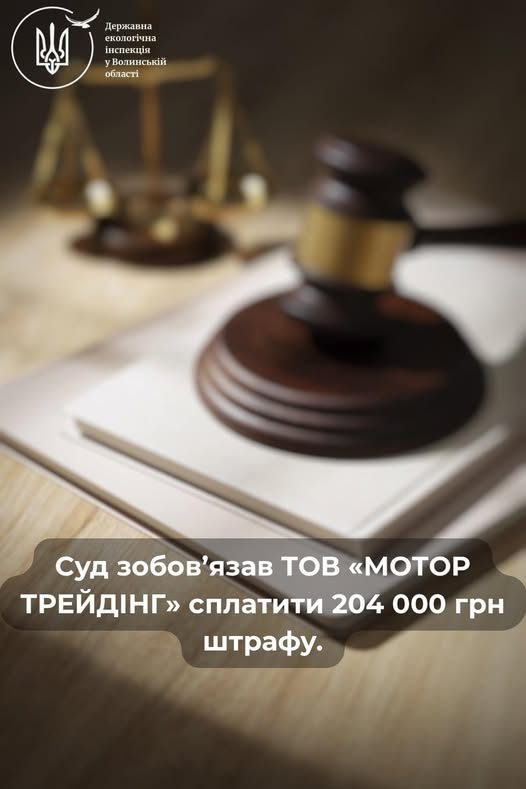 Суд задовольнив позов Державної екологічної інспекції у Волинській області у повному обсязі та ухвалив рішення про стягнення з ТОВ «МОТО ТРЕЙДІНГ» штрафних санкцій у розмірі 204 000 гривень.